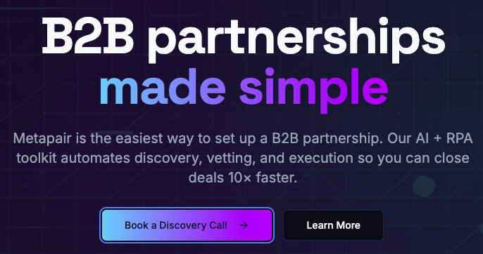 Metapair is the easiest way to set up a B2B partnership. Our AI + RPA toolkit automates discovery, vetting, and execution so you can close deals 10× faster.